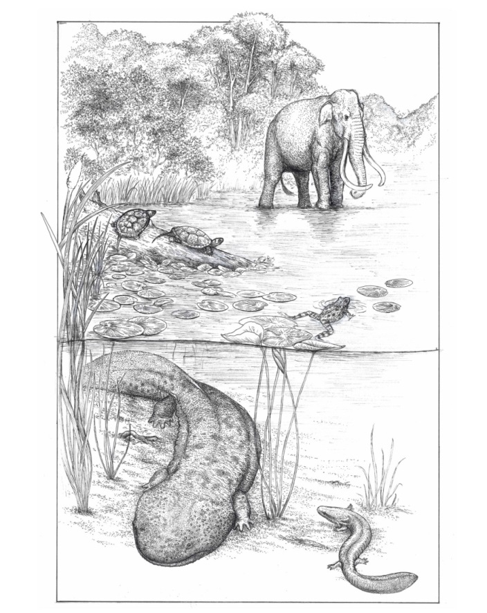 Реконструкция белореченской исполинской саламандры в среде обитания (рисунок А. Острошабова).