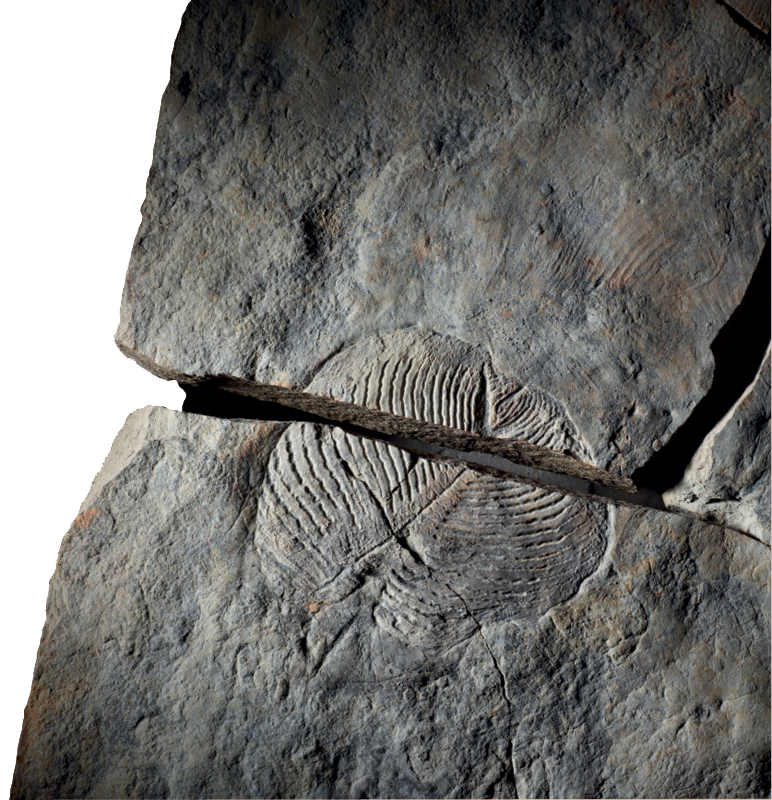 Плита, расположенная справа на стене зала, демонстрирует редчайший для палеонтологии случай совместного нахождения тел животных и оставленных ими следов. На ней располагаются отпечатки поперечно-расчлененных организмов вымершего типа Proarticulata, следов их передвижения и питания. Исследование этих остатков доказывает, что данные организмы принадлежали к царству животных. На плите хорошо видны отпечатки Dickinsonia и Yorgia. Рядом – две следовые дорожки этих животных. Эта уникальная плита происходит из мезенской свиты верхнего венда (возраст около 555 млн. лет) с Зимнего берега Белого моря в районе Зимнегорского маяка. Она была обнаружена, выделена из породы и изучена сотрудником Палеонтологического института им. А.А. Борисяка РАН А.Ю. Иванцовым.