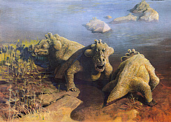 На подиуме экспонируются целые скелеты и черепа эстемменозуха уральского (Estemmenosuchus uralensis) из очерского местонахождения.